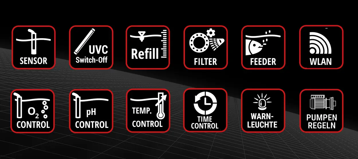 Ogni controllo è preimpostato in modo che “Plug and Play” sia una cosa ovvia. Ulteriori opzioni includono display della temperatura, ricarica automatica dell’acqua, spia esterna e alimentatore completamente automatico. La connessione WLAN (con controllo tramite app) è integrata automaticamente in tutti i controlli PROline e può essere utilizzata se necessario. Tipico Smartpond®!